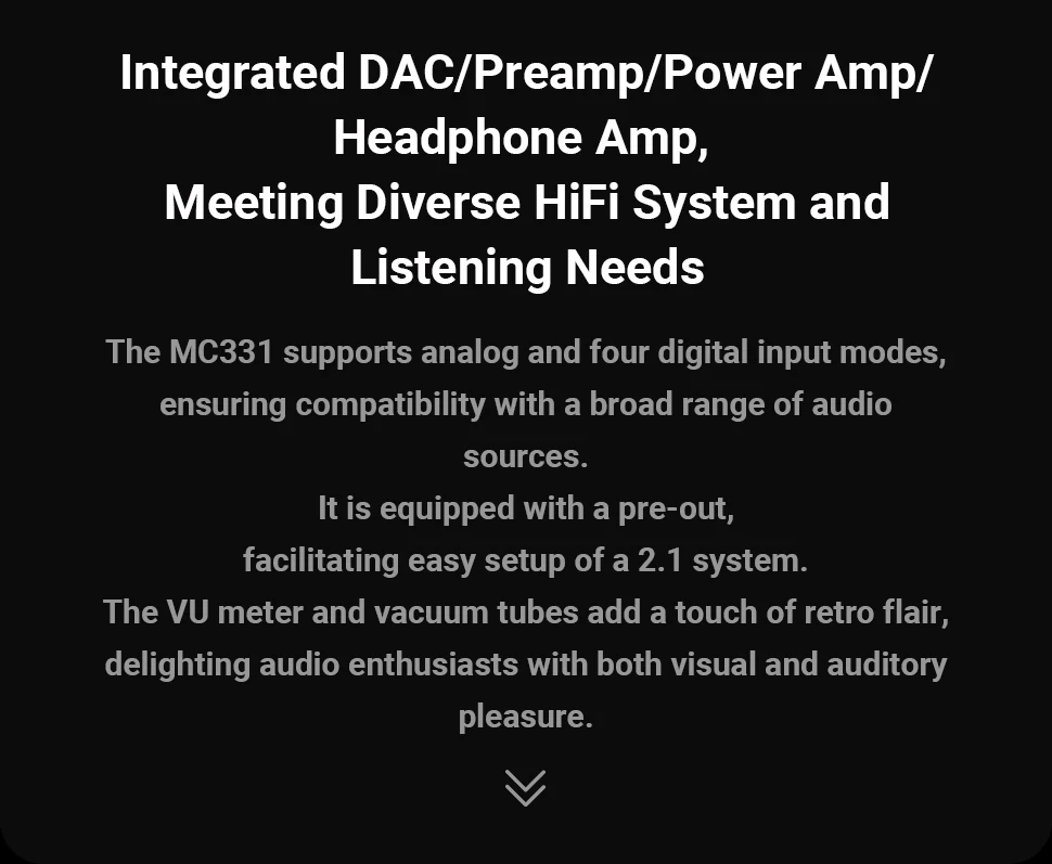 Compact Yet Powerful: The MC331 only takes up minimal desktop space but boasts a maximum power output of 105W x2@4Ω, effectively driving your bookshelf speakers. Additionally, it has a pre-out and a 3.5mm headphone output, making it versatile enough